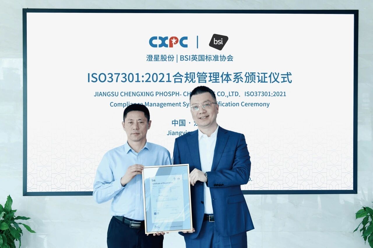 2025年3月26日,澄星股份正式获颁ISO37301合规管理体系认证证书,成为中国磷化工行业首家获得BSI认证的企业。此项权威认证,是对澄星在合规体系建设、全面风险防控、精细化运营管理等方面长期不懈努力的高度认可,更是推动公司未来向更高标准持续精进的强大动力。以此为全新起点,澄星将继续秉持 “诚信经营、合规发展” 的核心理念,为深化客户合作、拓展全球市场筑牢坚实的信任基石,推动公司在国际化竞争中行稳致远。